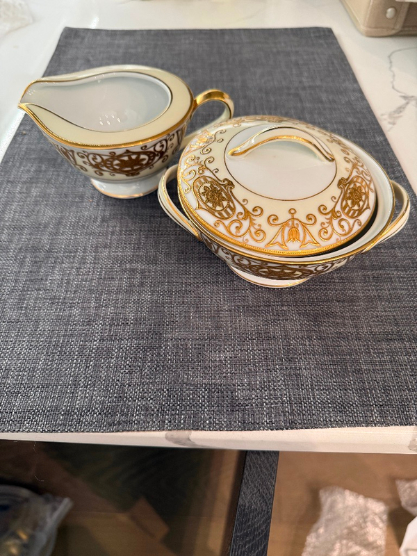 No 16034 Very good condition 5 pc place setting for 12 plus 28 unique serving pieces, 23 extra plates, White/off white/gold "M in wreath" with storage containers Pics online973 534 7403