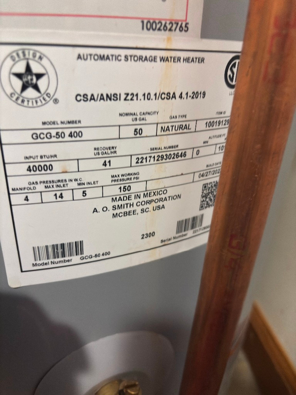 $400 OBO – 40,000 BTU, 50-gallon A.O. Smith gas hot water tank, manufactured April 2022, purchased ($870 new) and installed June 2022. This gas hot water tank is 3-1/2 years old, fully functional. This HW tank was replaced with a tankless water heater.