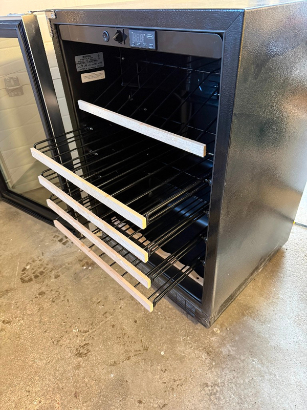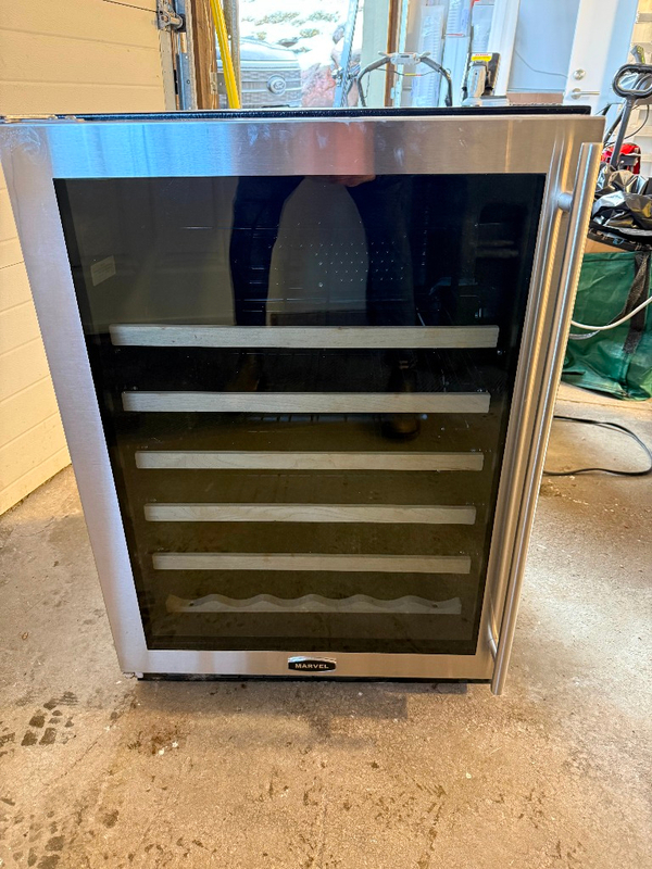 Professional "MicroSentry" unit. Fits standard 24" opening (Under-counter built-in). Capacity: 45 bottles. Features: Digital touch controls, maple-trimmed pull-out racks, and interior "theatre" lighting. Condition: Tested and holding temperature perfectly at 55°F. Very clean. MSRP: Originally $1,400+. Selling for $500.