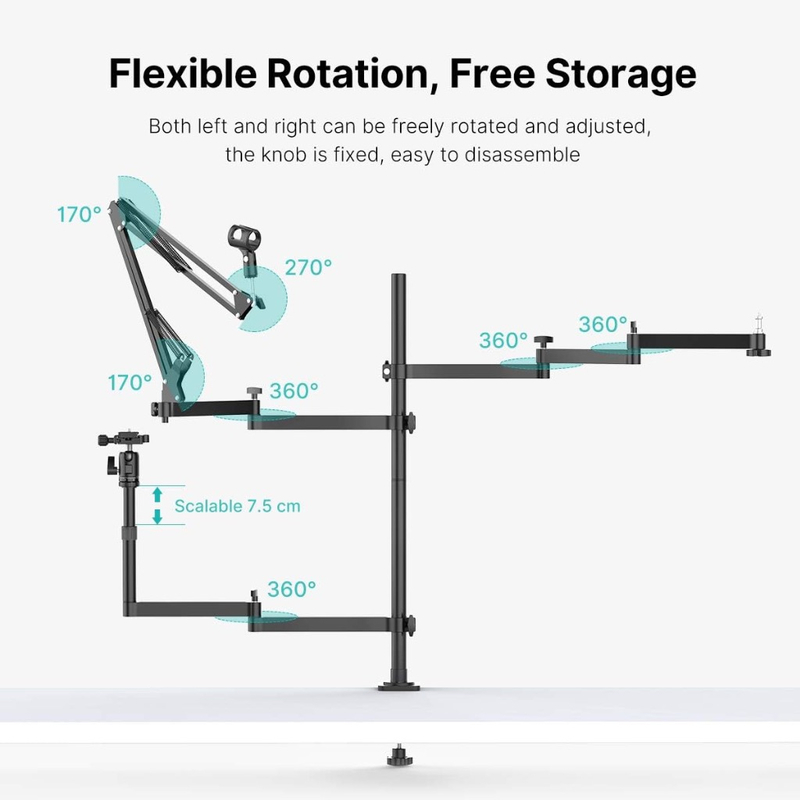 Boom Arms for live broadcasting from your desk Has multiple arms and mounts and is heavy duty so it can hold quite a bit of weight (30-50lbs) I'd say.Camera Guy