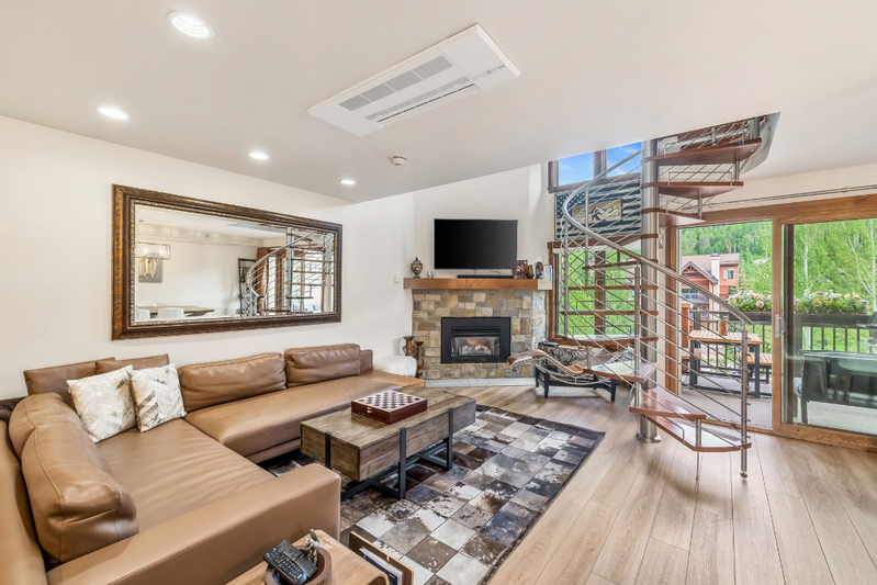 Alpine Elegance Meets Turn-Key Convenience in the Heart of Lionshead. Whether you're seeking a refined mountain retreat or a high-performing rental asset, this top-floor Lionsquare Lodge residence delivers both lifestyle and value. Step out your door and onto the slopes. Soak in panoramic south-facing views of Vail Mountain from your private balcony, or unwind fireside in the spacious, open-concept living and dining area after a day of skiing. Enjoy year-round comfort with air conditioning.