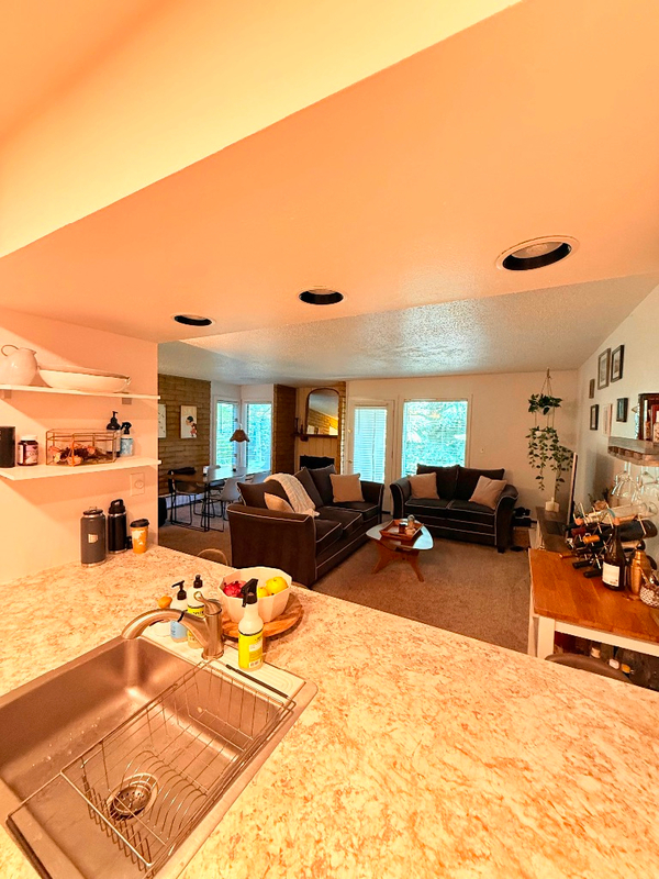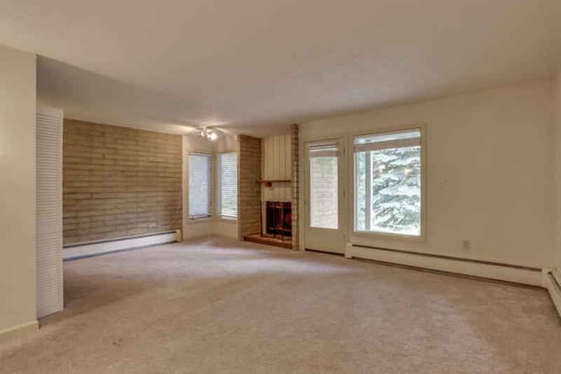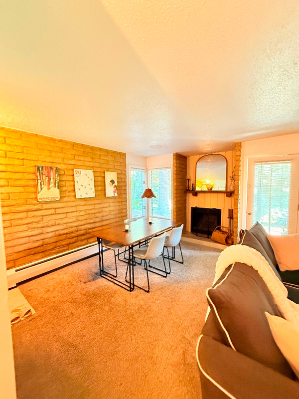 A wood-burning fireplace anchors the living room, creating a warm focal point after a day on the slopes. All utilities, including heat, are included in the rent for effortless living.