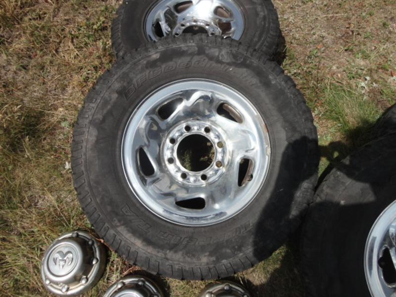 Chrome set in very good condition with hubcaps and nuts. Has mounted BFGoodrich T/A KO 245/75-16 tires worn at 6/32nds. The real value is in the rims. $300. The full size Spare is also available.