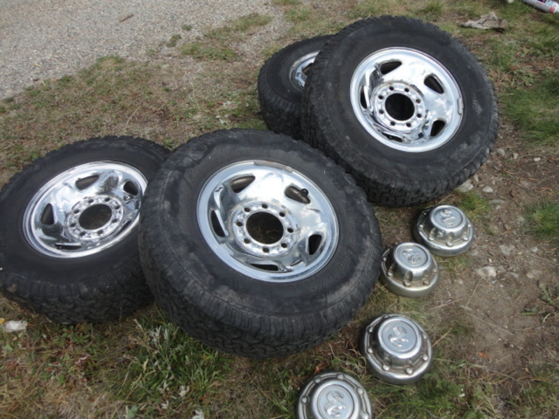 Chrome 8 lug set of 4 with hubcaps and lugnuts in very good condition. Has mounted BFGoodrich T/A KOs 245/75-16 E-Load 10-ply 6/32nds tread--the value is in the rims. The Spare is also available $300