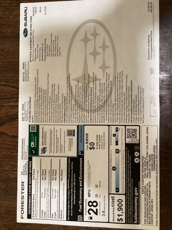 This Subaru Forester Touring is in excellent condition. See the image of the window sticker for specks. Also includes a padded pet liner for the cargo area and Weather Tech floor mats. Selling because I work remote and don’t use it. It is currently being financed by Subaru and they hold the title.